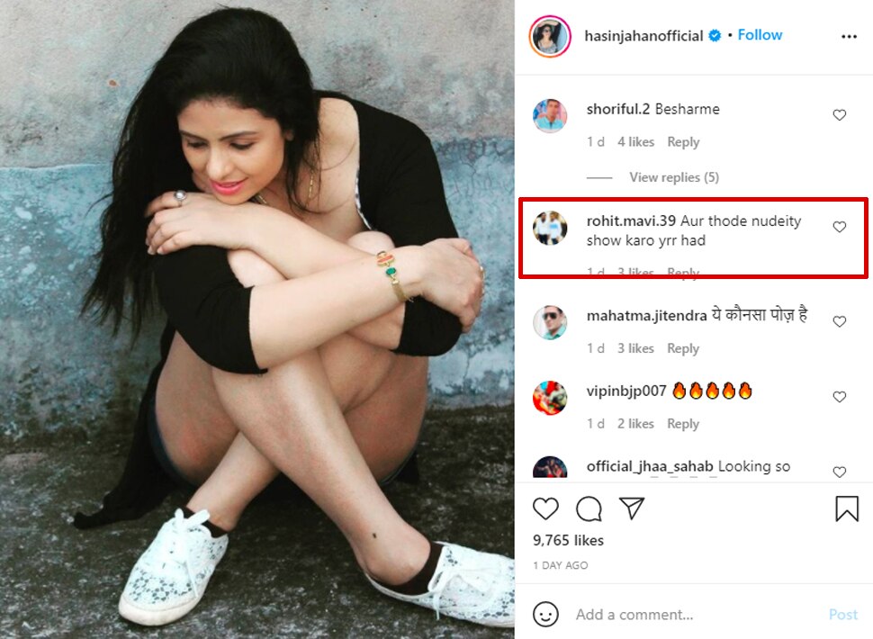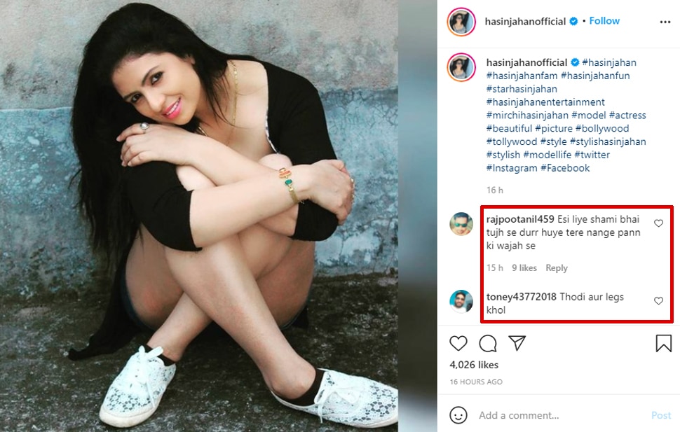 एक यूजर ने कमेंट करते हुए लिखा,”इसी लिए शमी तुझ से दूर हुए, तेरे नंगे पन की वजह से.” वहीं एक अन्य यूजर ने हसीन जहां की खुली टांगों को लेकर कमेंट करते हुए लिखा,”थोड़ी और लेग्स खोल.” वहीं एक दूसरे फोटो यूजर ने लिखा,”और थोड़ी न्यूडिटि शेयर करो यार हद.”