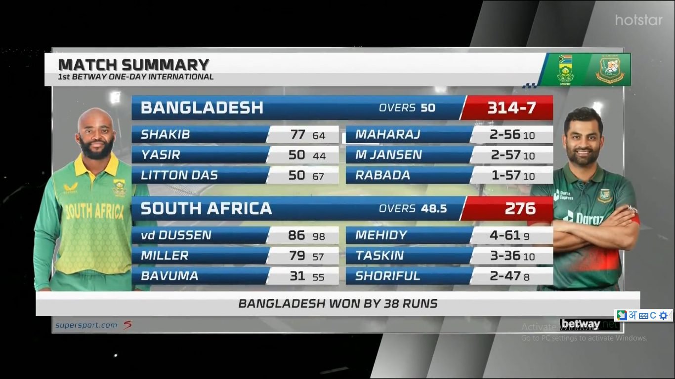 बांग्लादेश (Bangladesh) और साउथ अफ्रीका (South Africa) के मध्य सीरीज का पहला वनडे मैच खेला गया. साउथ अफ्रीका (South Africa) में खेले गये इस मैच में बांग्लादेश की टीम ने ऐतिहासिक जीत हासिल की. 3 वनडे की सीरीज का पहला मैच बांग्लादेश ने 38 रन से जीता. बांग्लादेश ने अफ्रीका में पहली बार जीता मैच … Read more