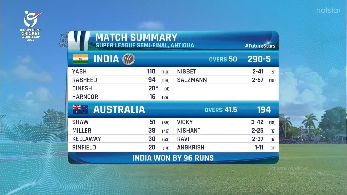 आईसीसी अंडर 19 वर्ल्ड कप (ICC U19 World Cup 2022) में 2 फरवरी को भारतीय टीम ने दूसरे सेमीफाइनल में ऑस्ट्रेलिया को 96 रनों से हराकर लगातार चौथी बार फाइनल में जगह बनाई। इससे पहले भारत ने 2016, 2018 और 2020 में भी फाइनल में जगह बनाई थी और 2018 में उन्होंने खिताब भी जीता था।